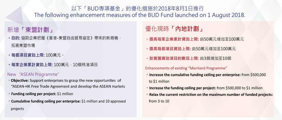 2018 年,政府通過為 BUD 項目注資 15 億港元;2020 年,BUD 的資助範圍擴大至東盟市場,納入「自貿協定計劃」;同年,計劃將申請 BUD 的資助上限由 $200 萬改為 $400 萬。